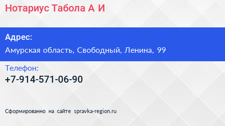 Нотариус Табола А.И. по адресу Амурская область, Свободный, Ленина, 99 в дальнейшем Организация, размещена в следующих категориях:
