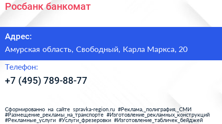 Росбанк, банкомат по адресу Амурская область, Свободный, Карла Маркса, 20 в дальнейшем Организация, размещена в следующих категориях: