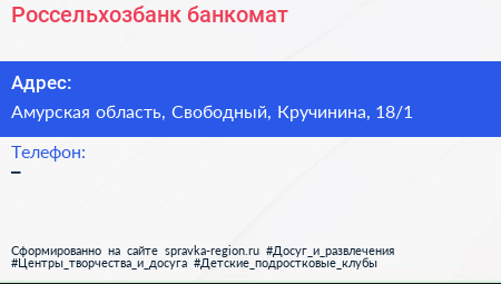Россельхозбанк, банкомат по адресу Амурская область, Свободный, Кручинина, 18/1 в дальнейшем Организация, размещена в следующих категориях: