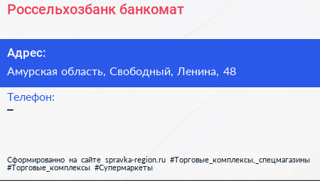 Россельхозбанк, банкомат по адресу Амурская область, Свободный, Ленина, 48 в дальнейшем Организация, размещена в следующих категориях: