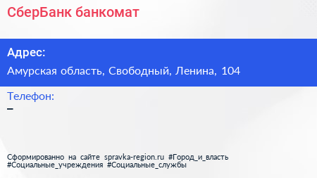 СберБанк, банкомат по адресу Амурская область, Свободный, Ленина, 104 в дальнейшем Организация, размещена в следующих категориях: