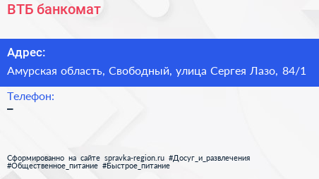 ВТБ, банкомат по адресу Амурская область, Свободный, улица Сергея Лазо, 84/1 в дальнейшем Организация, размещена в следующих категориях:
