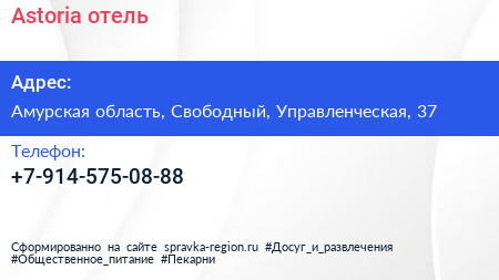 Astoria, отель по адресу Амурская область, Свободный, Управленческая, 37 в дальнейшем Организация, размещена в следующих категориях: