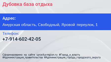 Дубовка, база отдыха по адресу Амурская область, Свободный, Яровой переулок, 1 в дальнейшем Организация, размещена в следующих категориях: