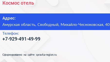 Космос, отель по адресу Амурская область, Свободный, Михайло-Чесноковская, 40 в дальнейшем Организация, размещена в следующих категориях: