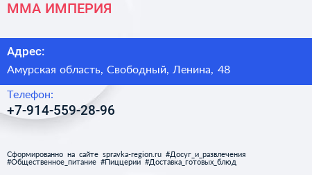 ММА ИМПЕРИЯ по адресу Амурская область, Свободный, Ленина, 48 в дальнейшем Организация, размещена в следующих категориях: