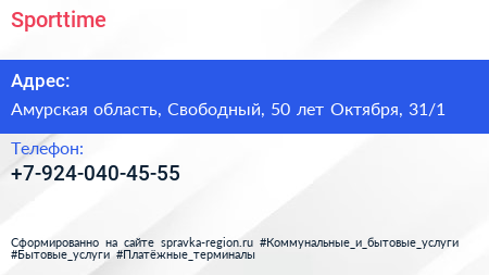 Sporttime по адресу Амурская область, Свободный, 50 лет Октября, 31/1 в дальнейшем Организация, размещена в следующих категориях: