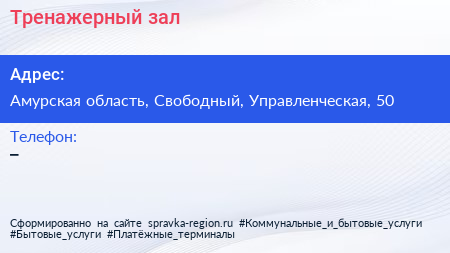Тренажерный зал по адресу Амурская область, Свободный, Управленческая, 50 в дальнейшем Организация, размещена в следующих категориях: