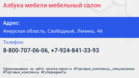 Азбука мебели, мебельный салон по адресу Амурская область, Свободный, Ленина, 46 в дальнейшем Организация, размещена в следующих категориях: