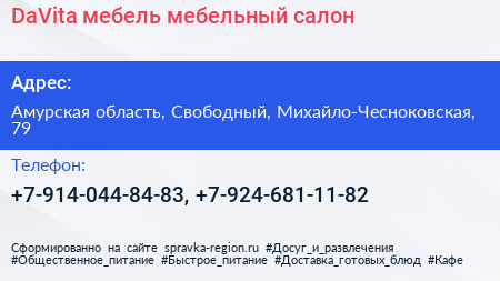 DaVita-мебель, мебельный салон по адресу Амурская область, Свободный, Михайло-Чесноковская, 79 в дальнейшем Организация, размещена в следующих категориях: