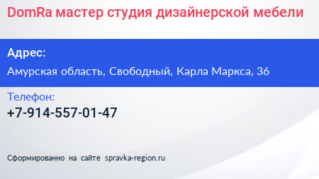 DomRa, мастер-студия дизайнерской мебели по адресу Амурская область, Свободный, Карла Маркса, 36 в дальнейшем Организация, размещена в следующих категориях: