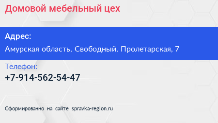Домовой, мебельный цех по адресу Амурская область, Свободный, Пролетарская, 7 в дальнейшем Организация, размещена в следующих категориях: