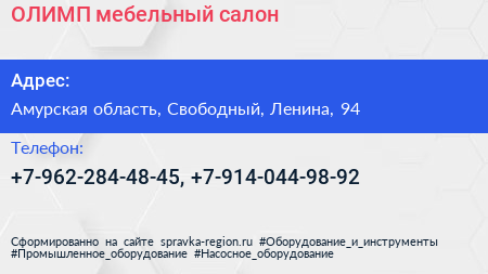 ОЛИМП, мебельный салон по адресу Амурская область, Свободный, Ленина, 94 в дальнейшем Организация, размещена в следующих категориях: