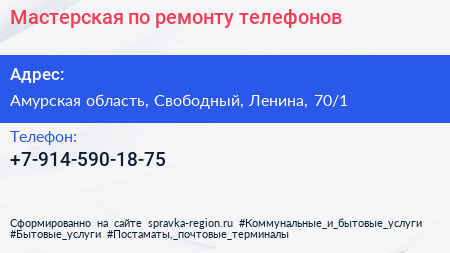 Мастерская по ремонту телефонов по адресу Амурская область, Свободный, Ленина, 70/1 в дальнейшем Организация, размещена в следующих категориях: