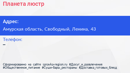 Планета люстр по адресу Амурская область, Свободный, Ленина, 43 в дальнейшем Организация, размещена в следующих категориях: