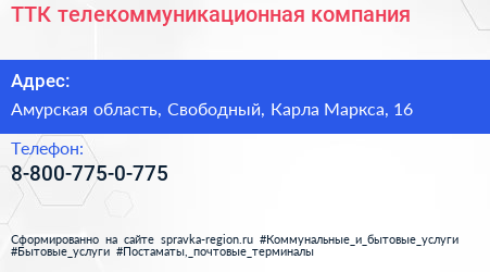 ТТК, телекоммуникационная компания по адресу Амурская область, Свободный, Карла Маркса, 16 в дальнейшем Организация, размещена в следующих категориях: