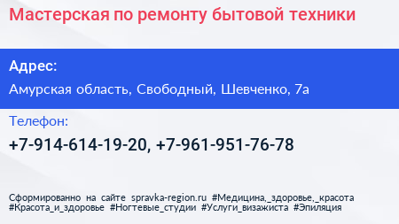 Мастерская по ремонту бытовой техники по адресу Амурская область, Свободный, Шевченко, 7а в дальнейшем Организация, размещена в следующих категориях: