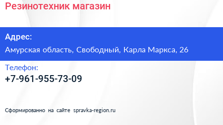 Резинотехник, магазин по адресу Амурская область, Свободный, Карла Маркса, 26 в дальнейшем Организация, размещена в следующих категориях:
