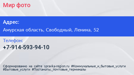 Мир фото по адресу Амурская область, Свободный, Ленина, 52 в дальнейшем Организация, размещена в следующих категориях:
