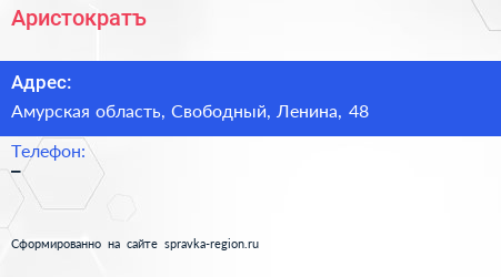 Аристократъ по адресу Амурская область, Свободный, Ленина, 48 в дальнейшем Организация, размещена в следующих категориях: