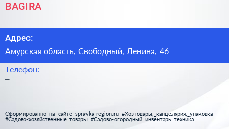 BAGIRA по адресу Амурская область, Свободный, Ленина, 46 в дальнейшем Организация, размещена в следующих категориях: