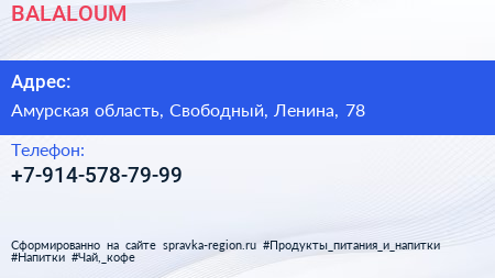 BALALOUM по адресу Амурская область, Свободный, Ленина, 78 в дальнейшем Организация, размещена в следующих категориях: