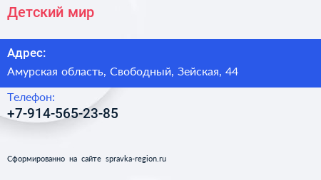 Детский мир по адресу Амурская область, Свободный, Зейская, 44 в дальнейшем Организация, размещена в следующих категориях: