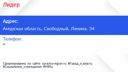 Лидер по адресу Амурская область, Свободный, Ленина, 54 в дальнейшем Организация, размещена в следующих категориях: