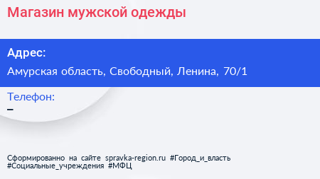 Магазин мужской одежды по адресу Амурская область, Свободный, Ленина, 70/1 в дальнейшем Организация, размещена в следующих категориях: