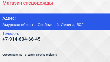 Магазин спецодежды по адресу Амурская область, Свободный, Ленина, 50/1 в дальнейшем Организация, размещена в следующих категориях:
