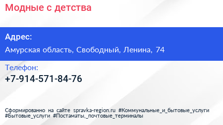 Модные с детства по адресу Амурская область, Свободный, Ленина, 74 в дальнейшем Организация, размещена в следующих категориях: