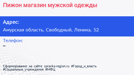 Пижон, магазин мужской одежды по адресу Амурская область, Свободный, Ленина, 52 в дальнейшем Организация, размещена в следующих категориях:
