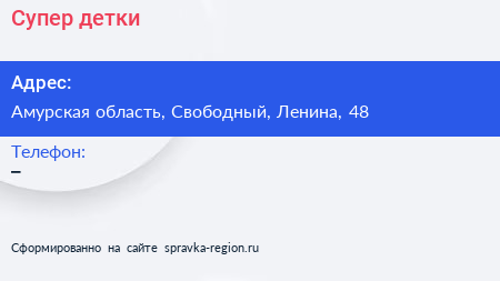 Супер детки по адресу Амурская область, Свободный, Ленина, 48 в дальнейшем Организация, размещена в следующих категориях: