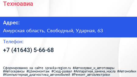 Техноавиа по адресу Амурская область, Свободный, Ударная, 63 в дальнейшем Организация, размещена в следующих категориях: