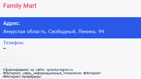 Family Mart по адресу Амурская область, Свободный, Ленина, 94 в дальнейшем Организация, размещена в следующих категориях: