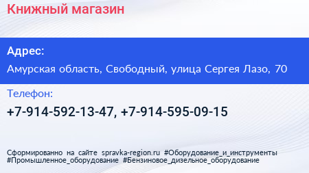 Книжный магазин по адресу Амурская область, Свободный, улица Сергея Лазо, 70 в дальнейшем Организация, размещена в следующих категориях: