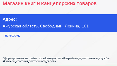 Магазин книг и канцелярских товаров по адресу Амурская область, Свободный, Ленина, 101 в дальнейшем Организация, размещена в следующих категориях: