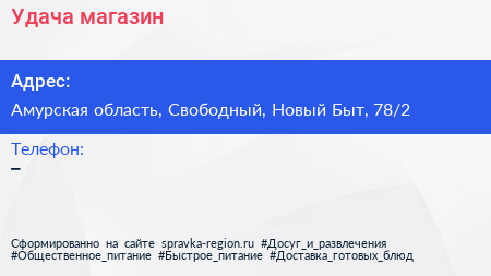Удача, магазин по адресу Амурская область, Свободный, Новый Быт, 78/2 в дальнейшем Организация, размещена в следующих категориях: