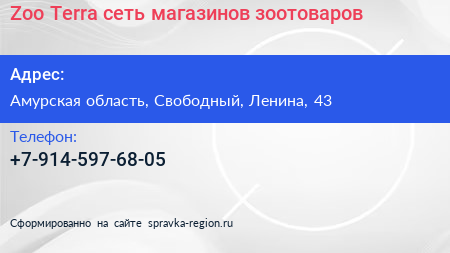 Zoo Terra, сеть магазинов зоотоваров по адресу Амурская область, Свободный, Ленина, 43 в дальнейшем Организация, размещена в следующих категориях: