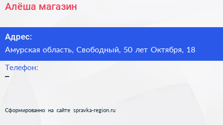 Алёша, магазин по адресу Амурская область, Свободный, 50 лет Октября, 18 в дальнейшем Организация, размещена в следующих категориях: