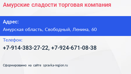 Амурские сладости, торговая компания по адресу Амурская область, Свободный, Ленина, 60 в дальнейшем Организация, размещена в следующих категориях: