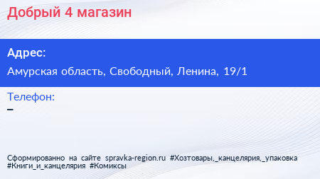Добрый 4, магазин по адресу Амурская область, Свободный, Ленина, 19/1 в дальнейшем Организация, размещена в следующих категориях: