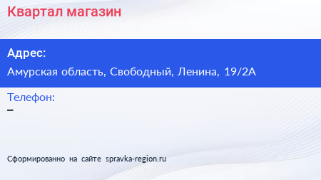 Квартал, магазин по адресу Амурская область, Свободный, Ленина, 19/2А в дальнейшем Организация, размещена в следующих категориях: