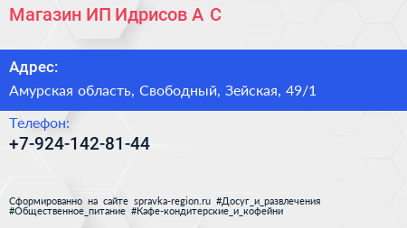 Магазин, ИП Идрисов А.С. по адресу Амурская область, Свободный, Зейская, 49/1 в дальнейшем Организация, размещена в следующих категориях: