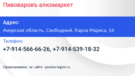 Пивоваровъ, алкомаркет по адресу Амурская область, Свободный, Карла Маркса, 16 в дальнейшем Организация, размещена в следующих категориях: