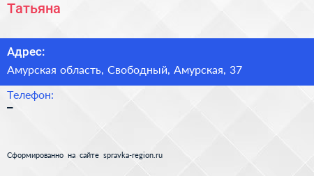 Татьяна по адресу Амурская область, Свободный, Амурская, 37 в дальнейшем Организация, размещена в следующих категориях: