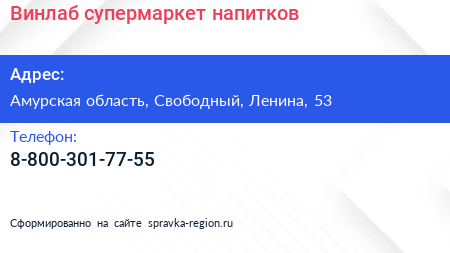 Винлаб, супермаркет напитков по адресу Амурская область, Свободный, Ленина, 53 в дальнейшем Организация, размещена в следующих категориях: