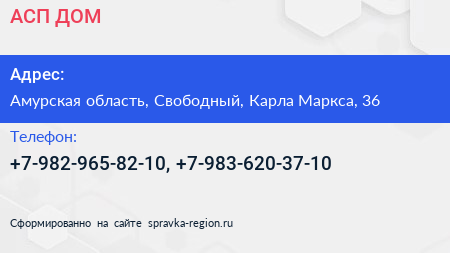 АСП ДОМ по адресу Амурская область, Свободный, Карла Маркса, 36 в дальнейшем Организация, размещена в следующих категориях: