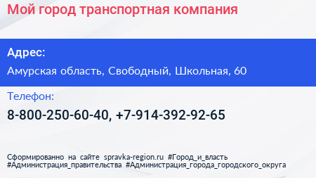 Мой город, транспортная компания по адресу Амурская область, Свободный, Школьная, 60 в дальнейшем Организация, размещена в следующих категориях: