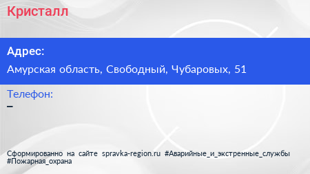 Кристалл по адресу Амурская область, Свободный, Чубаровых, 51 в дальнейшем Организация, размещена в следующих категориях: